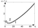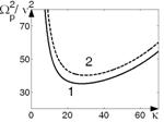 Найдем порог неустойчивости, для чего разделим в [1] действительную и мнимую часть, положив Imw=0. Полученная система решалась численно относительно W2p и w при следующих значениях параметров: a=0,1 мк, что соответствует Vi0≈3м/с, ni=104 см-3, d=10, Ti=Te=150 K, ni=6∙104c-1, VTi=80 м/с. При таких значениях параметров z≈3. Результаты представлены на рис. 1 (зависимость плазменной частоты аэрозолей от волнового числа) и на рис. 2 (зависимость частоты волны от волнового числа), k=(kVi0)/n – безразмерное волновое число, кривая 1 – без учета зарядки, кривая 2 – с учетом зарядки.