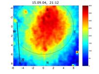 В сентябре 2004 г. на стенде «Сура» была проведена серия экспериментов по исследованию оптического свечения ночной ионосферы в красной (630 нм) линии атомарного кислорода при воздействии на ионосферу мощных КВ радиоволны. Свечение связано с излучением уровня O(1D) с энергией возбуждения 1,96 эВ и временем жизни 107 с. Возбуждение уровня происходит при соударении атомов с электронами, ускоренными ВЧ плазменными волнами, возникающими при воздействии [1]. Воздействие на ионосферу в эксперименте осуществлялось волной обыкновенной поляризации на частоте f0=4,3 МГц, эффективная мощность излучения стенда составляла 150 МВт, ширина его диаграммы направленности – 12˚, режим воздействия: 2 мин – излучение, 2 мин – пауза. Регистрация свечения проводилась с помощью любительской астрономической камеры SBIG ST9E с прямо освещаемой ПЗС матрицей 512·512 пикселов, которые могли быть объединены для повышения чувствительности, связанной с компьютером. Угол обзора камеры – 13º.