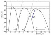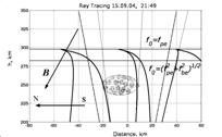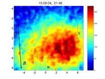 На рис. 1 представлены портреты ночного неба в красной линии, полученные 15.09.2004 в 21:12 и 21:48 мск. При построении рисунков из данных, зарегистрированных в последние 27 с воздействия, вычитались данные «темного фона» зарегистрированные в последние 27 с перед началом воздействия (соответственно в 21:10 и 21:46). На рисунке показаны также проекция геомагнитного поля на горизонтальную плоскость и прямолинейная проекция диаграммы стенда «Сура» на небосвод. Видно, что с течением времени область свечения смещается на север, в направлении геомагнитного поля, величина смещения достигает 3-4º. Кроме того, внутри области различимы структуры с большей яркостью свечения, вытянутые вдоль магнитного поля. На рис. 2 представлены расчетные траектории центрального и крайних (