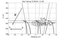 6º) лучей стенда в плоскости геомагнитного меридиана. Расчеты выполнены для ионограмм, зарегистрированных соответственно в 21:09 и 21:49. На рисунке показаны также прямолинейная проекция диаграммы стенда на небосвод (тонкие линии), поле зрения камеры SBIG ST9E (пунктир), направление магнитного поля, высоты отражения (f0=fpe) и верхнего гибридного резонанса (f0=(fpe2+fbe2)1/2) мощной волны, а также положение области свечения, соответствующее рис.1. Здесь fpe и fbe – плазменная и циклотронная частоты электронов. Согласно [1,2], оптимальные условия генерации свечения должны иметь место на высотах 230-260 км, поэтому на рис. 2 область свечения несколько условно помещена на высоте ≈ 250 км.