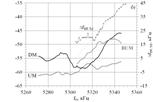 Согласно [1], при f0 ≈4fce downshifted maximum (DM) расположен в спектре ИРИ на отстройках ∆f= fИРИ – f0 ≈ – 10 ÷– 12 кГц; upshifted maximum (UM) с ∆f ≈ + 8 ÷ + 10 кГц расположен в спектре почти симметрично DM относительно частоты ВН; broad upshifted maximum (BUM) – на отстройках ∆f ≈ + 15 ÷ + 150 кГц, причем положение пика BUM, присутствующего в спектре при f0 ≥ nfce, зависит от f0 как ∆fBUM = f0 – nfce. При f0 ≈ nfce DM практически не наблюдается в спектре ИРИ. Согласно [2,3], такой эффект должен иметь место для частот ВН, близких к двойному (верхнегибридному и кратному циклотронному) резонансу, когда f0 ≈ fd ≈ fuh ≈ nfce (fuh = (fpe2 + fce2 )1/2 – верхнегибридная частота, n – номер гармоники). Такое пропадание DM в спектре ИРИ при прохождении 4-й гирогармоники хорошо видно на всех трех панелях рис.1. Видно, однако, что имеет место резкая асимметрия в зависимости свойств ИРИ от угла наклона по отношению к знаку расстройки f0 – 4fce. При увеличении угла наклона от 12º к 16º для f0 ≤ 4fce интенсивность DM-компоненты заметно уменьшалась, также как и интенсивность компоненты BUM при f0 ≈ 4fce. При f0 > 4fce ход зависимости интенсивности различных компонент ИРИ (DM и BUM) и отстройки ∆fBUM от f0 приблизительно одинаков для вертикального и наклонного воздействия. Указанный эффект может быть интерпретирован с помощью сопоставления траекторных расчетов для ВН с различной высотной зависимостью дисперсионных свойств плазменных волн от высоты при f0 < 4fce и f0 > 4fce в области двойного резонанса в ионосфере.