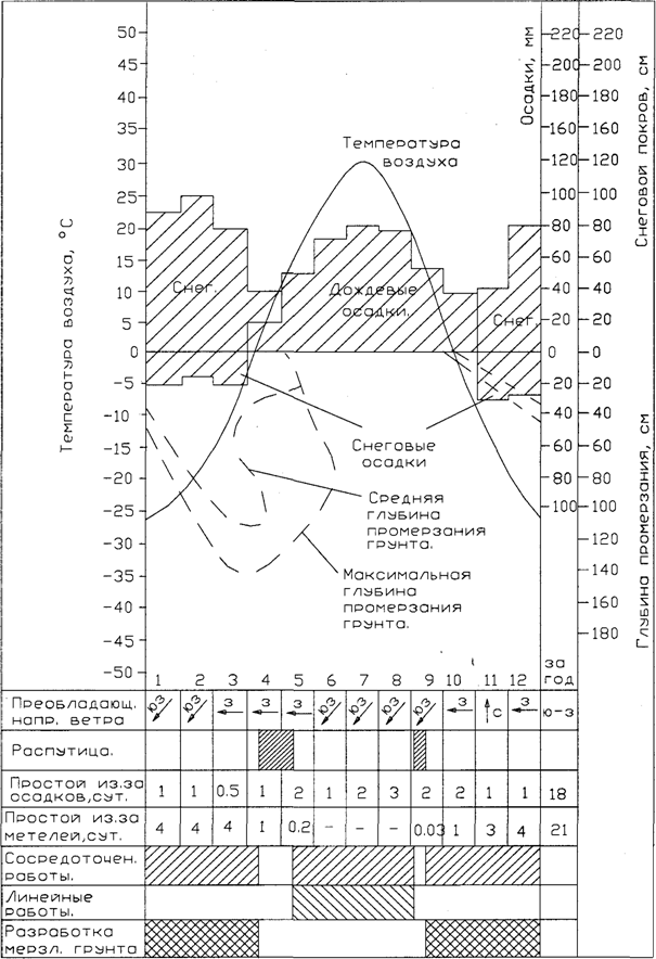 На основе СНиП [4] приводятся климатические показатели района строительства автомобильной дороги и составляется дорожно-климатический график (рис. 1). График необходим для назначения сроков производства дорожно-строительных работ в интервалах между весенней и осенней распутицами.