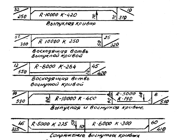 Наименьшие радиусы вертикальных кривых: - выпуклых, м - вогнутых | |||