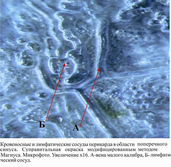 Изучены фрагменты секционного материала суправитальной ткани перикарда в 7 стандартных участках - в проекции поперечного, косого синусов, средней трети передней и задней стенок обоих желудочков и в области верхушки сердца. Были использованы анатомические методы (измерение и взвешивание сердца, определение объема и характера жидкости в полости перикарда). Для изучения лимфатических сосудов перикарда был использован модифицированный метод Магнуса, в котором наряду с заполнением просвета лимфатических сосудов кислородом выполняется дополнительное окрашивание наружной поверхности сосудистой стенки красителем – синим Эванса (Патент на изобретение № 000 РФ. Авторы: , , 2006), микрофотографирование влажных препаратов перикарда, морфометрия лимфатических сосудов.