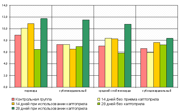 5. В эксперименте и клинике показано влияние каптоприла на уменьшение спаечного процесса в полости перикарда. Лечение экспериментального перикардита каптоприлом уменьшает площадь облитерации на 13,9% на 14 день и на 38,5% на 28 день терапии. У больных хроническими перикардитами при комбинированной терапии с использованием каптоприла адгезия перикарда не имеет тенденции к распространению.