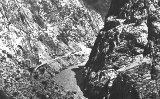 За Гнилой скалой начиналась крутая осыпь, белая настолько, что в солнечный день впору надевать светозащитные очки. Здесь тоже сыпало, камни летели прямо в Нарын, а сама осыпь казалась живой, так заметно проседала под тяжестью бульдозера врезанная в нее полка дороги. Но за осыпью можно было перевести дух. Тропа выводила на уступ речной террасы, получившей название «двенадцатой площадки». Затем долина резко сужалась, теперь не только правый, но и левый берег враз превращался в сумрачный, вечно затененный отвес, впрочем, еще более высокий и недоступный, потому что его до глянца отполированное подножие, как срезанное ножом, погружалось прямо в нарынские водовороты. Собственно никаких берегов в обычном понимании этого слова не было. Правый берег — это скальная плоскость горы Кыз-Курган. Левый — скальная плоскость горы Чон-Тегерек. Между ними изломанная полоска неба. Река стиснута, кажется, если прыгнуть, то можно достать рукой левый берег. Воздух и тот сжат, наполнен громоподобным гулом, стократ отраженным зеркалами скал. Голос человека не слышен. Он здесь ничто, человек. Напряжение горной тверди, вставшей на дыбы, ощутимо физически, кажется, две эти плоскости раздвинулись только что на какой-то миг и теперь под действием взаимного притяжения должны сомкнуться. Хочется поскорей выбраться на белый свет, вольный воздух, распрямиться, перевести дух, а потом уж оглянуться назад... Вот он, Токтогульский створ!