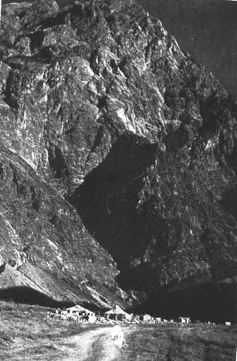 Пролетел вертолет, в вертолете находился Бушман, он увидел на седловине неподвижный бульдозер, а рядом пять-шесть человек, чем занятых — непонятно. А они надевали гусеницу. И поскольку деваться некуда, надели ее. Пока чинились, вниз не спускались, ночуя тут же, на 1300, облюбовав для жилья глубокую нишу под карнизом конгломератовой скалы... Впоследствии каменный козырек отвалился, рухнул на тропу, и все невольно вспоминали о том, как изо дня в день проезжали под этой глыбой, укрывались под ней от дождя, спали, сидели у костра. Вот ведь как удачно вышел срок этому дамоклову мечу: ночью да еще в воскресенье!