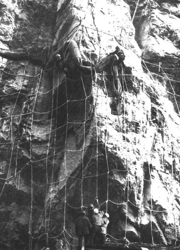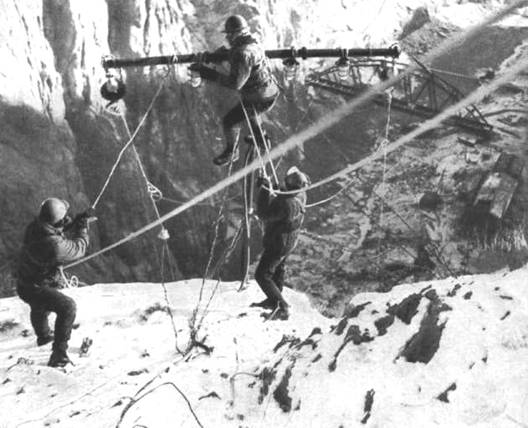 Впереди шли оборщики-верхолазы. За ними, пользуясь крючьями и навешенными веревками, поднимались бурильщики. Они оставляли за собой шпуры. В эти шпуры плотники забивали анкера, нарезанные из арматурной стали, прикручивали к ним тут же сколоченные трапы и перила. Весь этот крепежный лес, арматуру, мотки проволоки надо было как-то забрасывать наверх, и тогда люди выстраивались в цепочку, пристегивая себя к забитым в скалу крючьям, и начинали «качать» снизу вверх, из рук в руки. Этот живой транспортер существовал до тех пор, пока не появились грузовые канатные переправы. Но ведь и для этих переправ надо было затащить и лебедки, и трос, и кабель, а разговоры о применении вертолетов стали излюбленной темой острот во время перекуров.