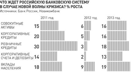 Что будет происходить дальше? Сценария два: продолжится умеренная стагнация или нас накроет новая волна кризиса. В первом случае в российской банковской системе в следующем году ожидается рост активов не более чем на 15%. Примерно на столько же вырастут корпоративные кредиты. Розничное кредитование будет расти чуть быстрее - на 17%. Ресурсная база также умерит темпы роста, особенно это будет касаться вкладов населения из-за "уменьшения склонности к сбережениям", которая наблюдается сейчас. Эксперты прогнозируют рост вкладов в 2012 году не более чем на 15%. Это в случае стагнации. Если накроет новый кризис, ресурсная база будет расти более медленно: 9% вклады населения и 2% - корпоративные счета. Активы банковской системы прирастут всего на 6%, корпоративные кредиты - на 5%, розничные - на 3%. Рост проблемных кредитов приведет к росту резервов. Опять возникнет проблема докапитализации.