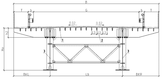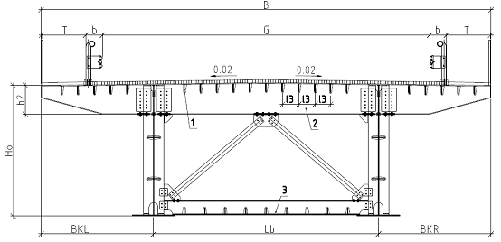 Предусмотрены два типа поперечных сечений: ортотропная плита проезжей части объединена с произвольным количеством(2-4) главных балок, объединенных системой поперечных связей(рис.2), ортотропная плита объединена с одной балкой коробчатого сечения(рис.3).
