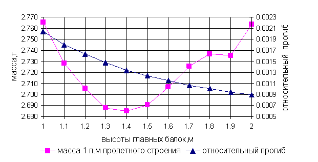 В качестве примера в автореферате на рис.5 приведена полученная зависимость погонной массы пролетного строения пролетом 84м. с двумя балками в поперечном сечении от высоты главных балок, на этом же рисунке приведены данные об относительных прогибах этих решений.