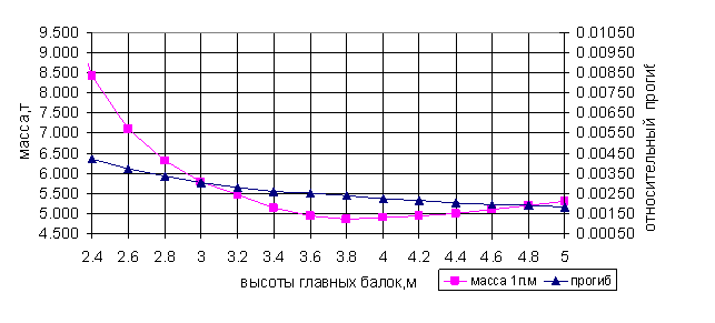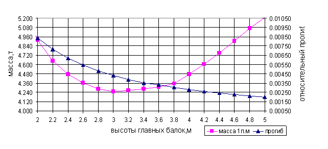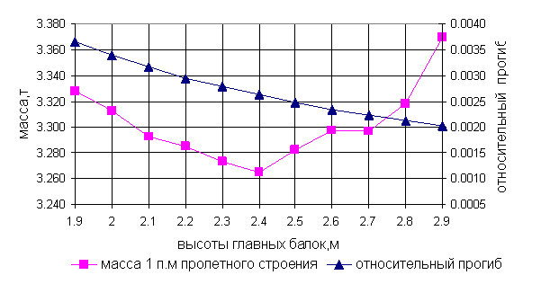 Во всех этих конструктивных решениях используются полностью расчетные сопротивления материала 15 ХСНД. Следовательно, зависимость массы рассмотренных конструктивных решений от высоты при одинаковых уровнях расчетных сопротивлений представляет собой по терминологии теории весовой поверхности профессора изотензу Минимальной массе этих конструктивных решений соответствует решение с высотой балок 2.4 м. Но ему соответствует относительный прогиб 0.0265, превышающий допустимое его значение,0.0025.,т. е.
