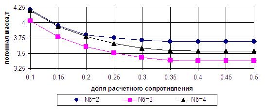 В качестве примера в автореферате на рис.8 приведены полученные зависимости массы пролетных строений пролетом 84 м при различном количестве балок в поперечном сечении и при различных значениях доли расчетного сопротивления стали 15ХСНД, выделяемой на восприятии местного действия нагрузки . Минимальной массы этого пролетного строения соответствует значение доли расчетного сопротивления 0.35 и с 3-мя балками в поперечном сечении. Анализ полученных данных позволил сделать вывод, что оптимальное значение доли расчетного сопротивления, выделяемой на восприятии местного действия нагрузки зависит от количества балок в поперечном сечении.