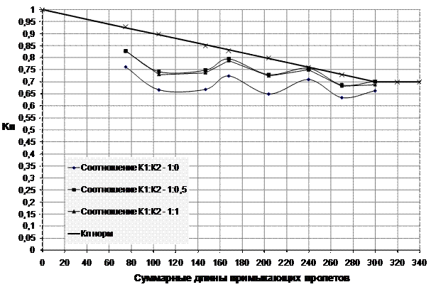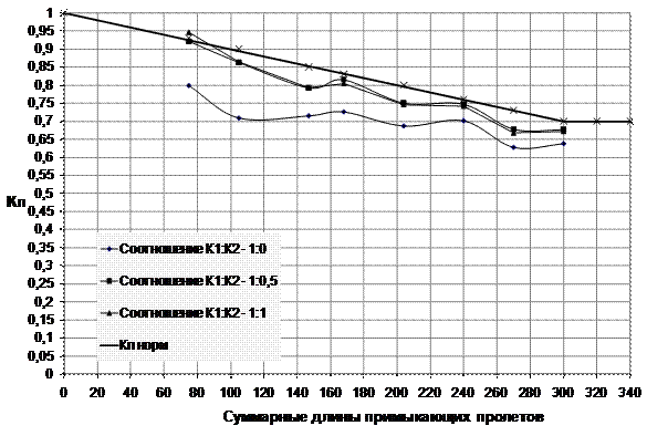 По полученным результатам построены графики поправочных коэффициентов Кп применительно к 2011 году и к 2090 году. На этих графиках прослеживается уменьшение поправочных коэффициентов примерно пропорционально суммарной длине примыкающих к опоре пролётов. Эта зависимость достаточно адекватно описывается формулой: