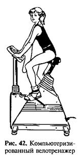 Езда на велосипеде укрепляет сердечно-сосудистую и дыхательную системы. При занятиях велосипедом для здоровья необходимо ездить не менее 3 раз в неделю, безостановочно в течение, как минимум, 30 мин, с ЧСС 60% от максимальной. Средняя оптимальная скорость, обеспечивающая хороший тренировочный эффект, около 25 км/ч. Скорость меньше 15 км/ч имеет очень низкую аэробную стоимость. Энергетический оптимум во время езды на велосипеде эквивалентен ритму движения педалей - 60-70 об./мин. Лицам пожилого возраста рекомендуется медленное катание со скоростью 4-5 км/ч. Продолжительность прогулок не должна превышать 1 - 1,5 ч. Большой оздоровительный аэробный эффект оказывают и занятия на компьютеризированном велотренажере с автоматическим заданием нагрузки и контролем ЧСС (рис. 42).