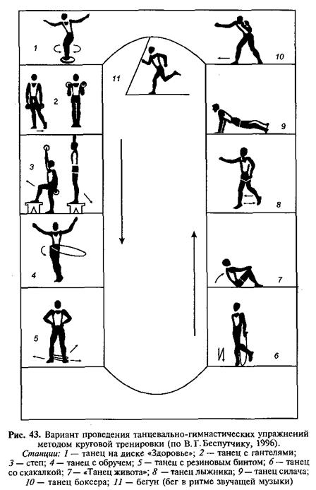 Аэробные упражнения на станциях (10-12 станций) выполняют в определенной последовательности в режиме: 30 с - работа на одной станции, 20 с - отдых. Занимающемуся необходимо пройти 3 круга, поддерживая заданный музыкальный темп (рис. 43).