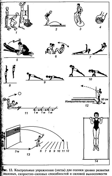 Для определения уровня развития скоростно-силовых способностей и силовой выносливости используются следующие контрольные упражнения: прыжки через скакалку (рис. 12, 3) подтягивания (рис. 12, 7, 8), отжимания на параллельных брусьях, от пола или от скамейки (рис. 12, 9, 10), поднимание туловища из положения лежа с согнутыми коленями (рис. 12, 6), висы на согнутых и полусогнутых руках (рис. 12, 14), подъем переворотом на высокой перекладине, прыжок в длину с места с двух ног (рис. 12, 2), тройной прыжок с ноги на ногу (вариант - только на правой и только на левой ноге), поднимание и опускание прямых ног до ограничителя (рис. 12, 5), прыжок вверх со взмахом (рис. 12, 1) и без взмаха рук (определяется высота выпрыгивания), метание набивного мяча (1-3 кг) из различных исходных положений двумя и одной рукой (рис. 12, 11, 12, 13) и т. д. Критериями оценки скоростно-силовых способностей и силовой выносливости служат число подтягиваний, отжиманий, время удержания определенного положения туловища, дальность метаний (бросков), прыжков и т. п.