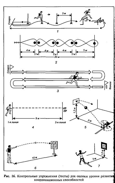 Некоторые контрольные упражнения для определения уровня координационных способностей приведены на рис. 16: 1) бег «змейкой» (1, 2); 2) челночный бег 3 х 10 м (3); 3) челночный бег 4x9 м с последовательной переноской двух кубиков за линию старта (4); 4) метание мяча в цель с различного расстояния и из различных исходных положений (5, б, 7).
