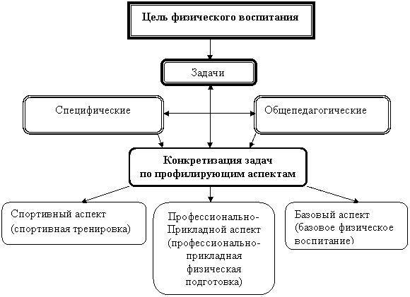 Для того чтобы цель сделать реально достижимой в физическом воспитании, решается комплекс конкретных задач (специфических и общепедагогических), которые отражают многогранность процесса воспитания, этапы возрастного развития воспитываемых, уровень их подготовленности, условия достижения намеченных результатов.