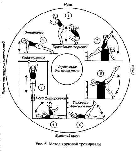 Круговой метод представляет собой последовательное выполнение специально подобранных физических упражнений, воздействующих на различные мышечные группы и функциональные системы по типу непрерывной или интервальной работы. Для каждого упражнения определяется место, которое называется «станцией». Обычно в круг включается 8-10 «станций». На каждой из них занимающийся выполняет одно из упражнений (например, подтягивания, приседания, отжимания в упоре, прыжки и др.) и проходит круг от 1 до 3 раз (рис.5)