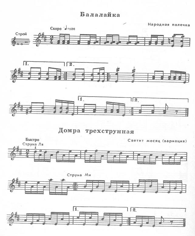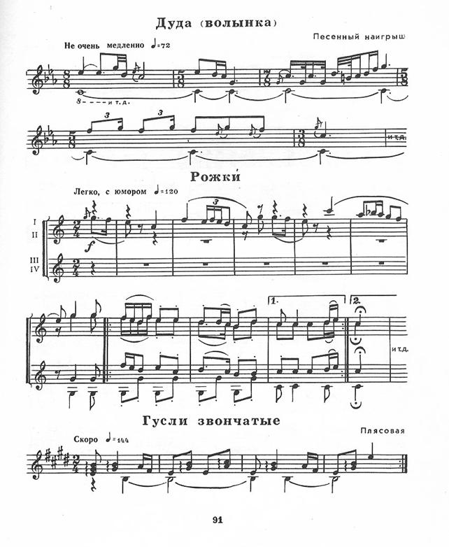 Сразу же оговоримся, что одной из особенностей народных оркестров, как и вообще народного искусства, является их разнообразие, нестандартность. К числу обязательных инструментов по-прежнему относятся группы домр и балалаек. Прочное и постоянное место заняли теперь и баяны (одна-две партии) или почти равнозначные им оркестровые гармонии: сопрано, альт, баритон (или бас) и контрабас. Их отличие от баянов в том, что они сконструированы специально для игры в оркестре и имеют лишь одну клавиатуру для правой руки. Тембр их более мягок, как бы слегка приглушен, что соответствует всему негромкому, камерному звучанию русского народного оркестра. Не следует пренебрегать группой ударных инструментов, украшающих любой оркестр, тем более народный. Сейчас одинаково широко используются как обычные, общепринятые ударные инструменты, такие, как треугольник, бубен, тарелки, малый и большой барабаны, колокольчики, ксилофон, так и самобытные национальные инструменты, описанные в нашей книге.