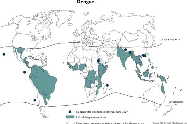 Карта географического распространения Денге, территории с риском передачи инфекции и границы распространения переносчика (комаров рода Aedes)