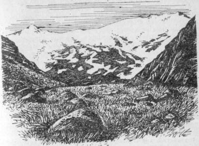 Пройдем, следуя за ним, вниз по ущелью от ледника Уллу-Кам. Вот на левый берег по каменистому гребню спустилась тропа с перевала Хотю-Тау, ведущего в оживленное Приэльбрусье— долину Баксана, в Балка-рию. Дальше идем вниз по этой тропе с незначительным уклоном около километра. Затем Уллу-Кам отходит от тропы, исчезая в глубоком каньоне, а тропа зигзагами — к огромному альпийскому лугу, с которого влево открывается вид на широкое горное ущелье, замыкающееся ослепительно белыми горами. Это — ущелье реки Уллу-Озень, первого крупного притока Уллу-Кама (выше в него впадают лишь крохотные ручейки), а луг, где сливаются Уллу-Кам и Уллу-Озень, известен под названием поляны Ворошилов кош. Название это возникло в 30-е годы, когда здесь находился кош колхоза имени . В последние годы пастухи не всегда располагаются здесь на лето, так как в 3 км ниже по реке имеется большой утепленный кош.