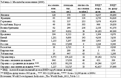 ü Масштабы экономики (таблица 2) – 2-3-е место в мире по номинальному объему ВНП, 20-30 места по ВНП на душу населения и по ВНП на душу населения по паритету покупательной способности.