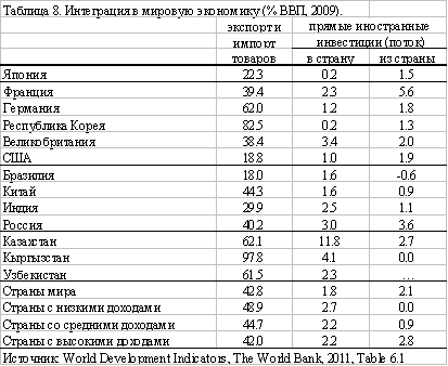 ü Интеграция в мировую экономику (таблица 8) – высокие абсолютные и низкие относительные значения экспорта и импорта, скромные размеры прямых иностранных инвестиций.