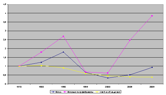 Сложившаяся в 1990-х годах производственно-экономическая ситуация в пищевой и перерабатывающей промышленности характеризовалась резким спадом производства продуктов питания (рис. 1), кризисным состоянием большинства предприятий пищевых отраслей, старением основных производственных фондов, особенно их активной части. Практически прекращена работа по созданию прогрессивных видов оборудования для пищевой и перерабатывающей промышленности, современных технологий, новых видов продуктов питания, обеспечивающих необходимый набор витаминов, белков. Значительно сократился ассортимент выпускаемой продукции, диабетических и специальных продуктов для населения, проживающего и работающего в тяжелых условиях.