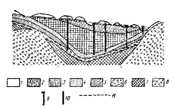 Отложении; 1 — четвертичные (лессовидные суглинки и пески с грунтовыми водами): 2 — третичные (пески, глины, мергели); 3 — меловые (мел, мергели): 4 — меловые (пески), артезианский водоносный горизонт; 5 — горение (глины); б — юрские (пески), артезианский водоносный горизонт; 7 — палеозойские; 8 — докембрий, кристаллические породы (гранит, гнейс и т. л.); 9 — скважина самоизливающая; 10 — скважина несамоизлпвающая; 11 — линия напорных уровней.