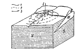 1 — гидроизогиисы, а — гидроивоиьезы; а — направление движения воды; I — очаг разгрузки; II — уровень воды; III — водоносный слой; IV — водоупор.