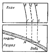 ДБ — внешний контур нефтеносности; ВГ — внутренний контур водоносности; МН — плоскость водо-нефтяного контакта; ДЕ — граница залежи, принимаемая при подсчете запасов нефти.