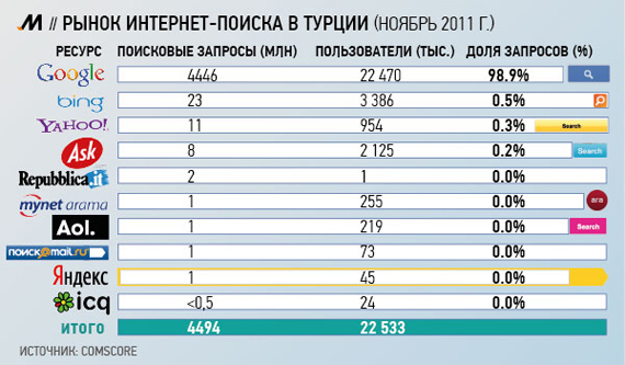 Ведущий российский интернет-поисковик «Яндекс» в Турции в ноябре 2011 года обработал 1 млн запросов, но у Google – 4,5 млрд запросов и 99% рынка. Об этом свидетельствуют данные исследовательской компании comScore