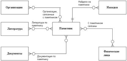 Изложенная выше схема системы "Памятник+" – основа для инфологической модели, которая, по сути, является звеном, соединяющим заказчика-пользователя системы управления и программиста-разработчика. Ограничение сложности на данном этапе обеспечивает прозрачность структуры базы данных для восприятия непрограммистом. Кроме того, как будет показано далее, с предложенной схемой хорошо согласуются европейский стандарт CIDOC, стандарты описания, предлагаемые ассоциацией АДИТ, а также структура системы BASE-INFO, разрабатываемой в ИА РАН, и существующий ныне паспорт памятника.