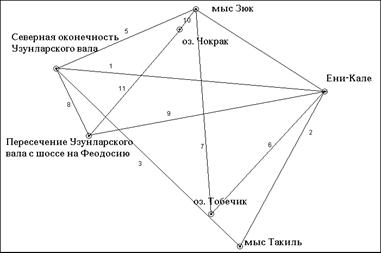 Сопоставление координатных сеток характеризует искажение картой Мухина масштаба в целом, но не позволяет судить о пропорциональности воспроизведения расстояний на местности при малых дальностях 0-50 км. Для исследования этого вопроса было выбрано семь точек из 63, однозначно идентифицируемых на карте Мухина: пересечение Узунларского вала с шоссе Керчь-Феодосия, обрыв на северной оконечности Узунларского вала, мыс на озере Чокрак, тригонометрический знак на мысе Зюк, крепость Ени-Кале, вершина мыса на озере Тобечик, тригонометрический знак на мысе Такиль. Эти точки распределены по границе рассматриваемой территории, и линии, их соединяющие, пересекают полуостров во всех направлениях, причем длина их лежит в пределах от 4 до 40 км. Для указанных семи точек была построена таблица расстояний, содержащая 21 элемент, 11 из которых являются независимыми (рис. 4.5).