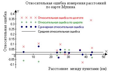 Далее были сопоставлены результаты определения отмеченных 11 расстояний при помощи GPS и по карте Мухина. Полученные данные, а также величины составляющих расстояний вдоль меридиана и параллели и величины абсолютных и относительных ошибок представлены в табл. 4.4. На рис. 4.6 показан