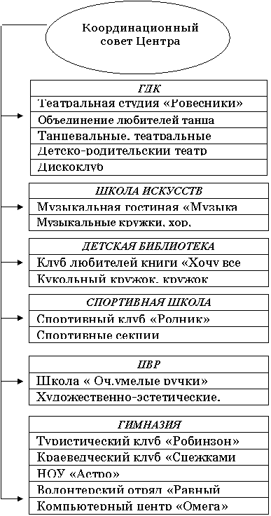 Координационный Совет КДЦ возглавляет председатель поселкового совета. Творческие объединения действуют на базе учреждений образования и культуры поселка и способствуют системной и планомерной организации воспитательной работы и в каникулярное время (Схема 1).