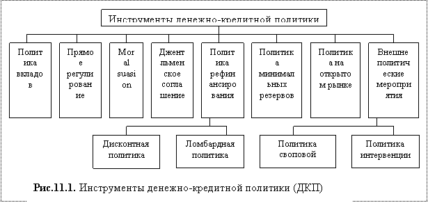 Рассмотрим теперь более подробно регулирующую функцию центрального банка, о которой уже упоминалось (см. параграф 9.1 и рис. 9.4). Данная функция реализуется с помощью совокупности инструментов денежно-кредитной политики (ДКП) (см. рис. 11.1).