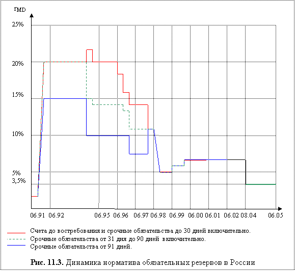 Политика минимальных резервных требований в России. Нормативы обязательных резервов кредитных обязательств были введены 1 июня 1991 г. (см.: рис. 11.3) – 2% для всех типов депозитных обязательств.