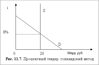 При голландском аукционе центральный банк начинает торги с максимальных ставок, постепенно снижая их (рис.11.7). Понижение осуществляется до тех пор, пока не оказываются проданные все ценные бумаги, вынесенные на аукцион. Минимальная цена ценных бумаг называется ценой отсечения. Именно по этой цене будут проданы ценные бумаги, которые подали заявки на покупку ценных бумаг (независимо от того, при какой цене были поданы эти заявки).