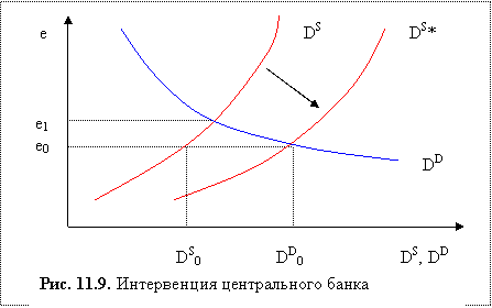 Поясним механизм валютной интервенции с помощью рис. 11.9. Допустим, величина поддерживаемого валютного курса равна e0. Тогда превышение спроса на валюту над предложением составляет DD0 – DS0. Этот курс можно удержать в том случае, если центральный банк уравновесит избыточный спрос дополнительным предложением валюты (валютной интервенцией).