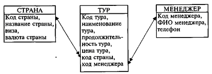 Для реализации установленных взаимосвязей необходимо в информационный объект ТУР добавить ключевые поля из связываемых сущностей МЕНЕДЖЕР и СТРАНА. Тогда описывающие •информационный объект реквизиты будут следующие: ТУР (код тура, наименование тура, продолжительность тура, цена тура, код страны, код менеджера).