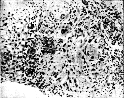 При пункции печени у больных туберкулезом легких с вовлечением печени наиболее часто выявляется НРГ или ГГ, часто в сочетании с НРГ. Для милиарной туберкулезной гранулемы характерен редко встречающийся при ГГ другой этиологии ка зеозный некроз в центре фолликула, периферия которого состоит из лимфоцитов, эпителиоидных клеток и гигантских клеток Лангганса.