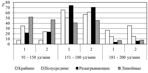 (полусредние и линейные), либо в диапазоне ЧСС от 151 до 180 уд/мин (крайние и разыгрывающие).