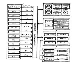 Датчики угловых скоростей (ДУС), линейных ускорений (ДЛУ), углов атаки (ДУА), положения ручки управления (ДПР-23) и др. совместно с бортовыми системами обеспечивают выдачу в вычислитель информации о параметрах полета и положении самолета. С системой автоматического управления сопряжено следующее бортовое оборудование самолета (рис. 4.42).