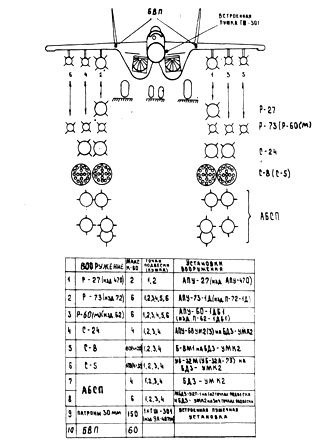 1-метка цели в режимах обзора РЛС; 2-скоростъ полета приборная, при наведении по КРУ-истинная; 3-метка опознавания в режимах обзора РЛС; 4-заданнаяс КРУ "Бирюза"истинная скорость; 5-индекс тенденции изменения скорости полета; 6 - строб захвата РЛС; 7 - вектор текущей перегрузки в режимах бомбометания; 8 - индекс текущей дальности до цели в режиме НО при прицеливании несинхронным методом и визуально невидимой воздушной цели. Вершина киля соответствует дальности 1200 м, а основание - дальности 200 м; 9 - база цели, установленной на ПСР (индицируется на месте шкалы курса в режиме НО при атаке воздушной цели); 10 - шкала и индекс текущего курса в режимах обзора; 11 - прицельное кольцо при применении УР по воздушным целям; метки визирования цели при выдаче целеуказания с помощью КУ в режиме ОПТ; метка визирования цели при прицеливании несинхронным методом в режиме НО по визуально видимой цели; кольцо грубого прицеливания при стрельбе несинхронным методом в режиме НО по визуально невидимой цели; прицельная марка при атаках наземных целей с прицеливанием методом ПЗ; директорное кольцо заданной перегрузки при бомбометании; 12 - метка положения антенны РЛС в режиме автосопровождения цели с применением УР; метка точного прицеливания в режиме НО при атаках воздушных целей с прицеливанием несинхронным методом по визуально невидимой цели; 13 - строб захвата КОЛС; 14 - неподвижное электронное перекрестив; 15 - символ самолета; 16 - заданная с КРУ "Бирюза" высота цели; 17 - высота от СВС, а при наличии справа индекса Р - от радиовысотомера; 18 - шкала тангажа; 19 - прицельная дорожка при прицеливании методом "Прогноз-дорожка"; 20 - линия, ограничивающая рабочее поле экранов СЕИ в режиме обзора РЛС или КОЛС; 21 - метка шкалы крена; 22 - метка горизонта (на ИПВ); 23 - положение зоны обзора РЛС по углу места(на ИПВ); 24 - линия авиагоризонта; 25 - тип оружия на выбранных подвесках (временно допускается высвечивание на СЕИ признака С-5 при наличии на самолете АПУ-68УМ2 и отсутствии подвесок); 26 - остаток боекомплекта пушки в четвертях; номер текущей строки в режиме обзора РЛС (на ИПВ); 27 - готовность глиссады; 28 - готовность УР к пуску; 29 - наличие оружия на подвесках;