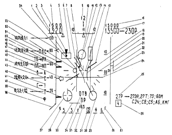 30 - прицельная марка при атаках наземных целей с применением неуправляемого оружия при прицеливании несинхронным методом; 31 - несход и обесточивание УР; 32 - дальность до ППМ (аэродрома) в режиме навигации; 33 - команда "Пуск разрешен"; 34 - команда "Отворот"; 35 - положение зоны поиска РЛС (КОЛС) по азимуту; 36 - готовность курса; 37 - прицельная марка с дуговой шкалой текущей дальности при прицеливании по воздушным целям несинхронным методом по информации от КОЛС или РЛС по визуально видимой цели; 38 - ракурс цели; 39,40 - разовые команды "Форсаж", "Привод" от КРУ "Бирюза"; 41 - минимальная дальность применения ракет и пушки; 42 - разовая команда "Перенацеливание" от КРУ "Бирюза". Команда "Горка" в режимах прицеливания с РЛПК с применением УР по воздушным целям, команда на выполнение полупетли при бомбометании с кабрирования; 43 - разовая команда "Свой" от системы опознавания при атаке своей цели только в режиме СУВ РЛС; 44 - разовая команда "Атака" при захвате цели на автосопровождение РЛС или КОЛС, а также при выработке команды на излучение ЛД при атаках наземных целей. Разовая команда "Вертикаль" от КРУ "Бирюза"; 45 - индекс текущей дальности до цели или времени, оставшегося до сброса АБСП (начала кабрирования) в режимах бомбометания; 46 - активная помеха, пассивная помеха; 47 - признак используемого режима РЛС или КОЛС; 48 - шкала текущей дальности до цели или времени, оставшегося до сброса АБСП (начала кабрирования); 49,50 - максимальные разрешенные дальности пуска (Др макс 2 Др макс 1); 51 - признак атаки в переднюю полусферу цели; 52 - метка управления по курсу при наземном наведении или полете по маршруту в режиме "Навигация"; метка отклонения от курса и глиссады в режиме "Посадка"; 53 - индекс текущей дальности до цели от системы наземного наведения; 54 - зона захвата цели в режимах РЛС-БЛ. БОЙ или ТП-Б. БОЙ