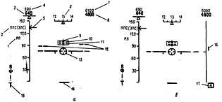 1 — признак включения излучения БРЛС; 2 — полусфера атаки (ППС — передняя полусфера, ЗПС — задняя полусфера); 3 — текущее значение истинной скорости полета истребителя; 4 — заданное значение истинной скорости полета истребителя с НАСУ; 5 — текущая дальность до цели с НАСУ; 6 — шкала и индекс текущего курса; 7 — высота полета цели; 8 — барометрическая высота полета истребителя; 9 — строб захвата цели; 10 — метка опознавания; 11 — метка цели; 12 — четка ложных целей; 13 — кольцо управления истребителем в горизонтальной плоскости; 14 — положение зоны обзора по азимуту; 13 — разовые команды с НАСУ; 16 — угломестное положение зоны обзора относительно горизонта; 17 — номер строки зоны обзора.