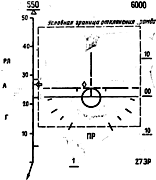 Справа от шкалы дальности появляются метка текущей дальности и зона разрешенных дальностей пуска ракет, а также прицельное кольцо, метка положения антенны РЛПК («ромб» или «точка»), метка вектора скорости цели и неподвижное перекрестие.